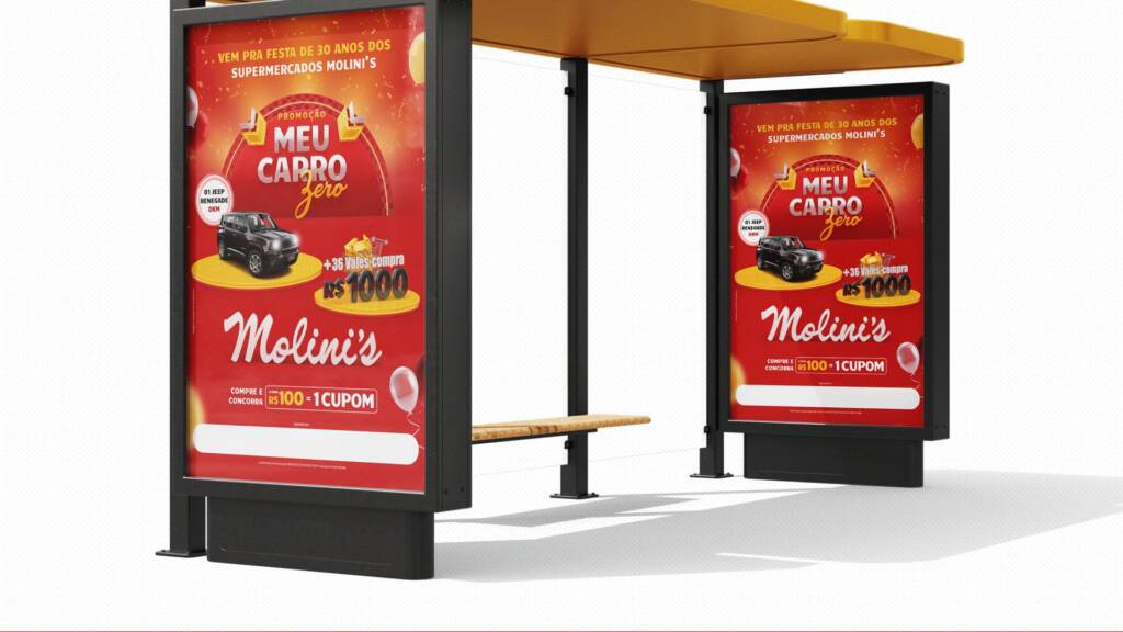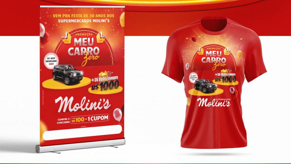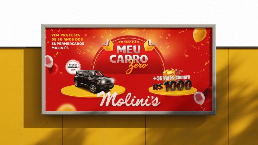Desenvolvemos a Campanha Meu Carro Zero Molini’s, criando o conceito visual e a identidade da ação comemorativa. O projeto envolveu a criação dos materiais gráficos e peças de comunicação, com foco em impacto visual, destaque para os prêmios e fortalecimento do engajamento do público com a marca.