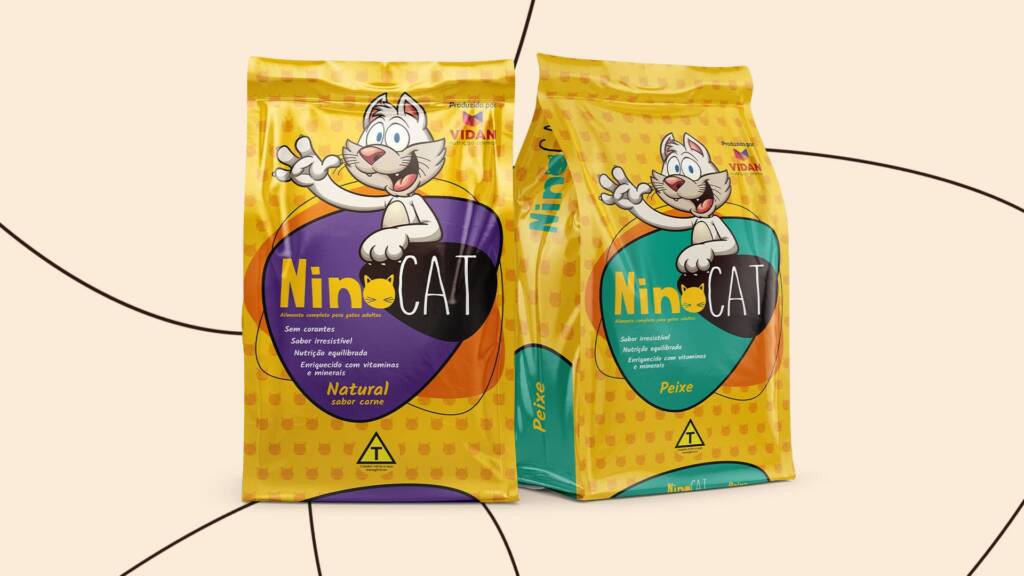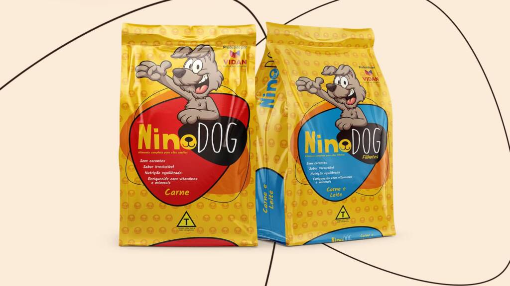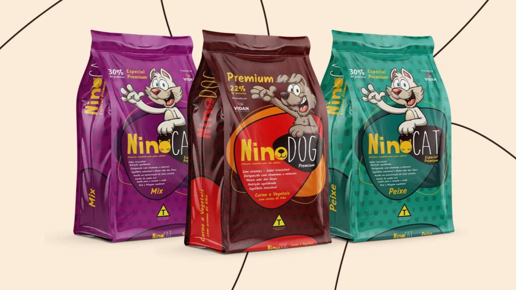 Desenvolvemos o design da embalagem Nino com foco em impacto visual, clareza de informações e empatia com o público final. A paleta vibrante, aliada à ilustração amigável do mascote, cria uma comunicação direta e acessível, transmitindo confiança, alegria e cuidado com os pets. A composição gráfica foi pensada para garantir destaque no ponto de venda, facilitar a identificação do produto e reforçar os atributos de qualidade, nutrição e sabor, fortalecendo a conexão emocional entre a marca, o tutor e o animal.